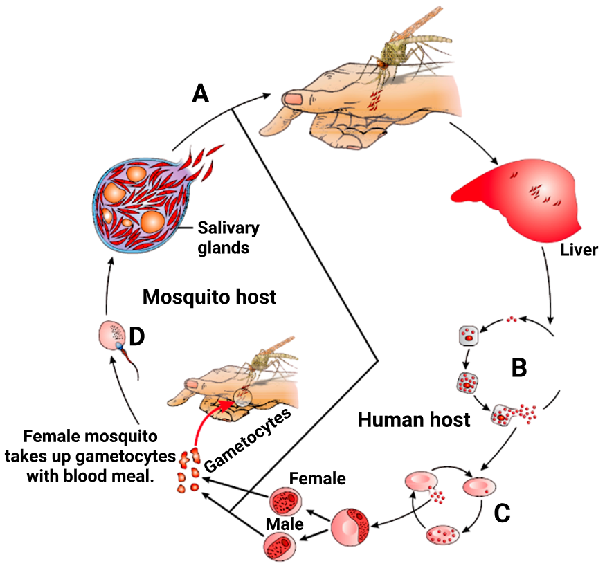At stage A, the mosquito injects sporozoites, not merozoites, into the human bloodstream.