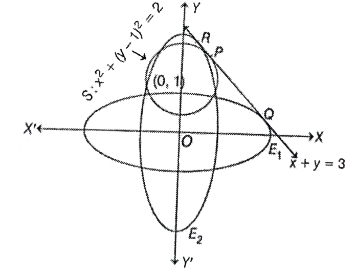 \(E_1\) has its major axis on the \(x\)-axis (equation \(\frac{x^2}{a^2}+\frac{y^2}{b^2}=1\) with \(a>b\) ). \(E_2\) has its major axis on the \(y\)-axis (equation \(\frac{x^2}{A^2}+\frac{y^2}{B^2}=1\) with \(B>A\) ). For a line \(y=m x+c\) to touch \(\frac{x^2}{a^2}+ \frac{y^2}{b^2}=1\), the point of tangency is \(\left(\frac{-a^2 m}{c}, \frac{b^2}{c}\right)\). Here, \(m=-1\) and \(c=3\).