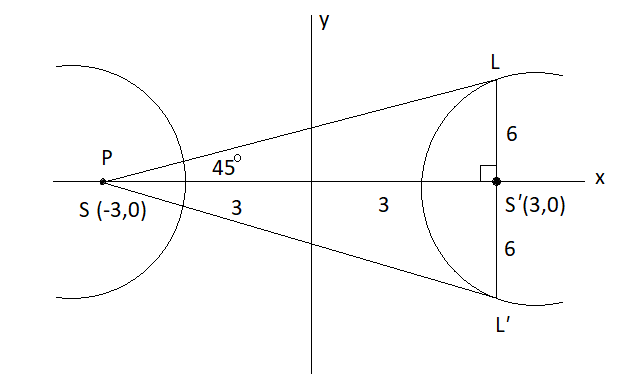 The problem states that the latus rectum \(L L^{\prime}\) subtends a right angle at \(P(-3,0)\). Due to symmetry about the x -axis, the line segment \(P L\) must make an angle of \(45^{\circ}\) with the x -axis (the transverse axis).