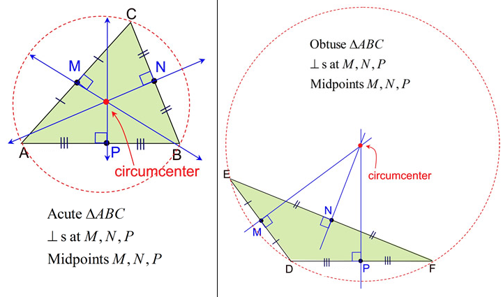 Solution: The circumcenter of a triangle is the intersection point of the triangle’s three perpendicular bisectors, which is also the center of the triangle’s circumcircle. This point is equidistant from all three vertices of the triangle, and its location within, on, or outside the triangle depends on whether the triangle is acute, right, or obtuse, respectively.