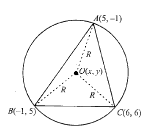 Example 2: Find the coordinates of the circumcentre of the triangle whose vertices are \(A(5,-1), B(-1,5)\), and \(C(6,6)\). Find its radius also.