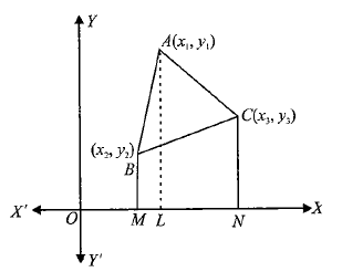 Let \(A B C\) be a triangle whose vertices are \(A\left(x_1, y_1\right), B\left(x_2, y_2\right)\), and \(C\left(x_3, y_3\right)\). Draw \(A L, B M\), and \(C N\) as perpendiculars from \(A, B\), and \(C\) on the \(x\)-axis. Clearly, \(A B M L, A L N C\) and \(B M N C\) are all trapeziums.