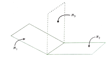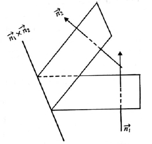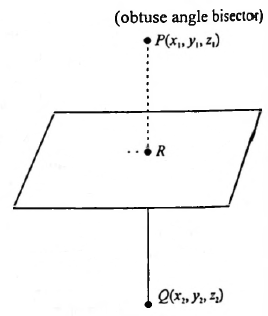 ii. If \(a_1 a_2+b_1 b_2+c_1 c_2<0\), the origin lies in the acute angle between the two planes and the equation of the bisector of the acute angle between the two planes is \(\frac{a_1 x+b_1 y+c_1 z+d_1}{\sqrt{a_1^2+b_1^2+c_1^2}}=-\frac{a_2 x+b_2 y+c_2 z+d_2}{\sqrt{a_2^2+b_2^2+c_2^2}}\).