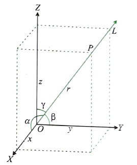 If a directed line \(L\), passing through the origin, makes angles \(\alpha, \beta\) and \(\gamma\) with the \(x\)-, \(y\) – and \(z\)-axes, respectively, called direction angles, then the cosines of these angles, namely, \(\cos \alpha, \cos \beta\) and \(\cos \gamma\), are called the direction cosines of the directed line \(L\).