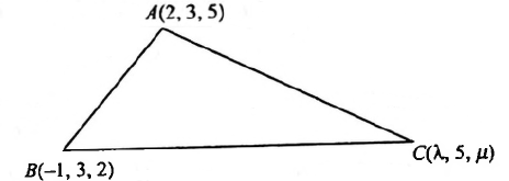 Illustration 1: \(A B C\) is a triangle and \(A=(2,3,5), B=(-1,3,2)\) and \(C=(\lambda, 5, \mu)\). If the median through \(A\) is equally inclined to the axes, then find the value of \(\lambda\) and \(\mu\).