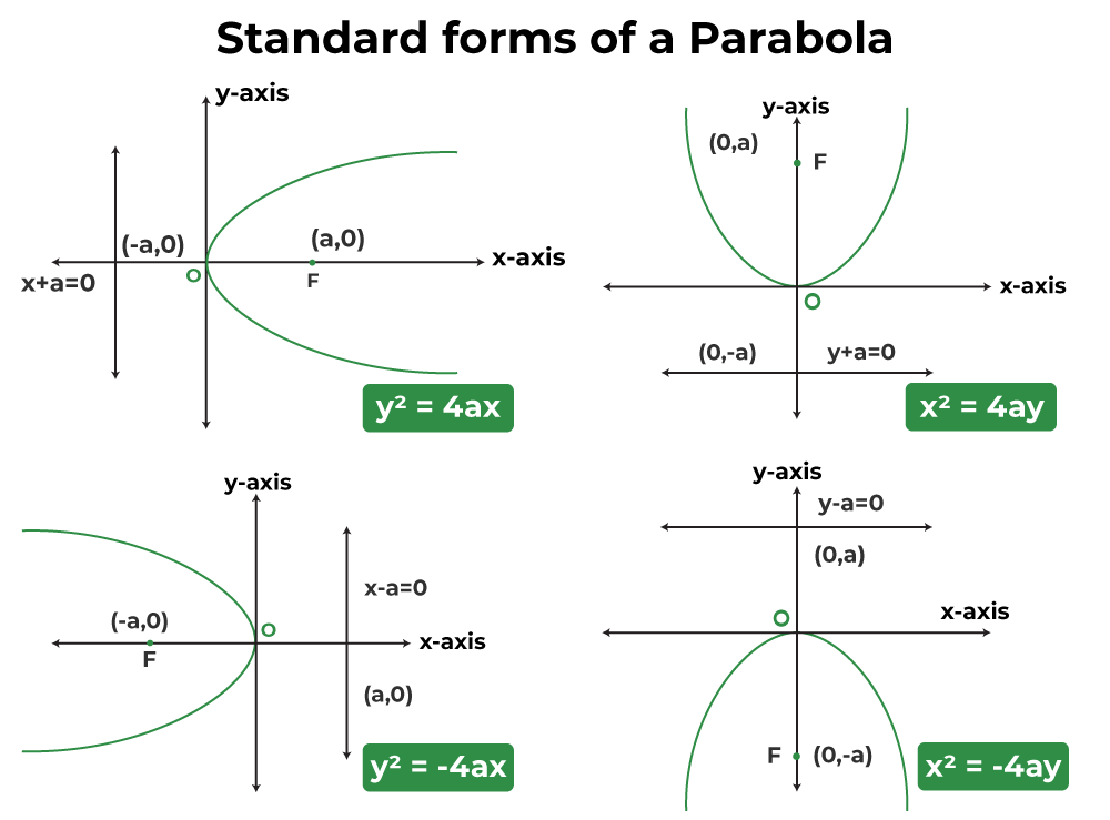 • The general equation of a parabola whose axis is parallel to \(x\)-axis is \(x=a y^2+b y+c\) and the general equation of a parabola whose axis is parallel to \(y\)-axis is \(y=a x^2+b x+c\).