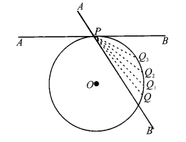 Let \(P\) be the fixed point and \(Q\) move along the circle towards \(P\), then the secant \(P Q\) turns about \(P\). In the limit, when \(Q\) coincides with \(P\), then the secant \(A B\) becomes a tangent to a circle at the point \(P\).