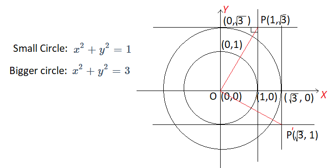 Example 51: If the tangent from a point \(P\) to the circle \(x^2+y^2=1\) is perpendicular to the tangent from \(P\) to the circle \(x^2+y^2=3\), then the locus of \(P\) is