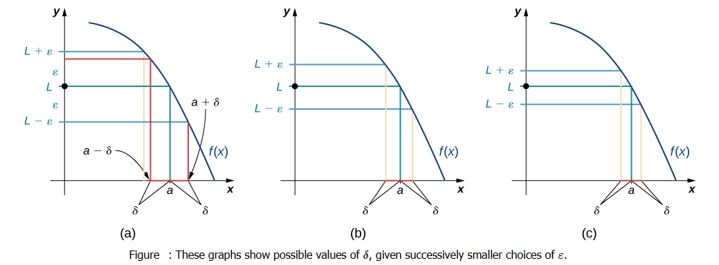 We can get a better handle on this definition by looking at the definition geometrically. Figure below shows possible values of \(\delta\) for various choices of \(\varepsilon>0\) for a given function \(f(x)\), a number \(a\), and a limit \(L\) at \(a\). Notice that as we choose smaller values of \(\varepsilon\) (the distance between the function and the limit), we can always find a \(\delta\) small enough so that if we have chosen an \(x\) value within \(\delta\) of \(a\), then the value of \(f(x)\) is within \(\varepsilon\) of the limit \(L\).