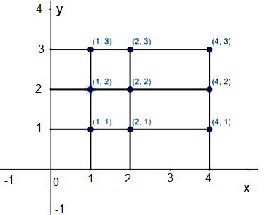 Example 7: If \(A=\{1,2,4\}\) and \(B=\{1,2,3\}\), find \(A \times B\) and show it graphically.