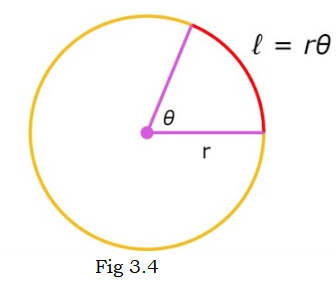 The picture shown in Fig 3.4 illustrates the relationship between the radius, and the central angle in radians. The formula is \(l=r \theta\) where s represents the arc length, \(l=r \theta\) represents the central angle in radians and \(r\) is the length of the radius.