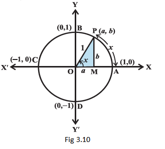 Consider a unit circle with centre at the origin of the coordinate axes. Let \(\mathrm{P}(a, b)\) be any point on the circle with angle \(\mathrm{AOP}=x\) radian, i.e., length of arc \(\mathrm{AP}=x(\mathrm{Fig} 3.10)\)