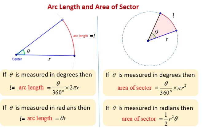 l=\theta \times \frac{\pi}{180} \times r \quad \text { (when } \theta \text { is in degrees) }
