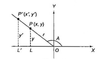 These quantities are functions of angle \(A\) alone. They do not depend on the choice of point \(P\) and the terminal ray. If we choose a different point \(P^{\prime}\left(x^{\prime}, y^{\prime}\right)\) on the terminal ray of \(A\) at a distance \(r^{\prime}\) from the origin, it is clear that \(x^{\prime}\) and \(y^{\prime}\) will have the same sign as that of \(x\) and \(y\), respectively, because of similar triangles \(\triangle O P L\) and \(\triangle O P^{\prime} L^{\prime}\).