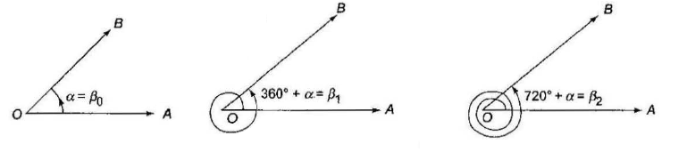 The revolving line (radius vector) starts from the initial position \(\overrightarrow{O A}\) and makes \(n\) complete revolutions in anticlockwise direction and also a further angle \(\alpha\) in the same direction. We then have a certain angle \(\beta_n\) given by \(\beta_n=360^{\circ} \times n+\alpha\), where \(0^{\circ}<\alpha<360^{\circ}\) and \(n\) is a positive integer or zero.