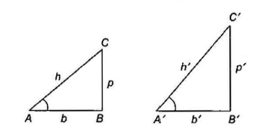 The ratio of any two sides of the triangle depends only on measure of angle \(A\), for if we take a larger and smaller right angle triangles as shown in Fig. above, we have \(\frac{h}{h^{\prime}}=\frac{b}{b^{\prime}}=\frac{p}{p^{\prime}}\) (as these triangles are similar).
