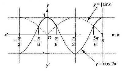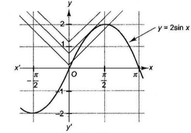 Equation \(2 \sin x=|x|+a\) will have a solution so long as the line \(y=|x|+a\) intersects or at least touches the curve, \(y=2 \sin x\). In this case, we must have \(d y / d x=2 \cos x=1=\) the slope of the line \(\Rightarrow x=\pi / 3\).