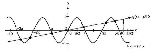 Solution: Here, let \(f(x)=\sin x\) and \(g(x)=\frac{x}{10}\). Also, we know that \(-1 \leq \sin x \leq 1\).