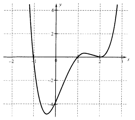 (b) The root of the equation \(f(x)=4\) occurs for the values of \(x\) where the graphs of \(y=f(x)\) and \(y=4\) intersect. From the diagram, for these point of intersection \(x=-2\) and \(x=3\). Hence, roots of the equation \(f(x)=0\) are \(x=-2\) and \(x=3\).