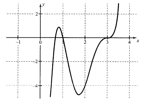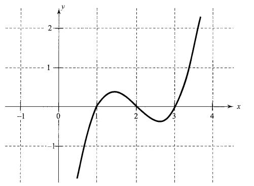 Illustration 3: Consider the function \(f(x)=x^3-6 x^2+11 x-6\), now for \(f(x)=0\) we have \((x-1)(x-2)(x-3)=0\) or \(x=1,2,3\). Then graph of \(y=f(x)\) cuts \(x\)-axis at three values of \(x, x=1,2,3\). Following is the graph of \(y=f(x)\).