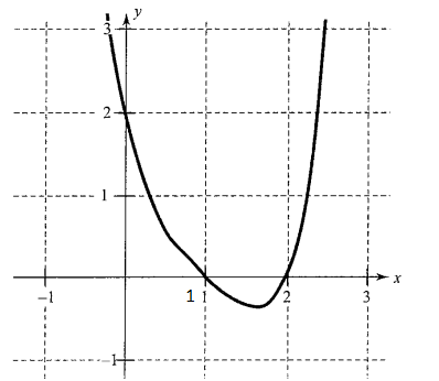 Illustration 4: Consider the function \(f(x)=\left(x^2-3 x+2\right)\left(x^2-x+1\right)\), now for \(f(x)=0\) we have \(x=1\) or \(x=2\), as \(x^2-x+1=0\) is not possible for any real value of \(x\). Hence, \(f(x)=0\) has only two real roots and cuts \(x\)-axis for only two values of \(x, x=1\) and \(x=2\).Following is the graph of \(y=f(x)\).