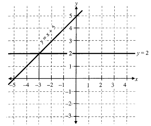 Graph of \(y=2\) is a line parallel to \(x\)-axis at height 2 unit above \(x\)-axis. Now in the figure, we can see that graphs of \(y=x+5\) and \(y=2\) intersect at point \((-3,2)\) where value of \(x=-3\).
