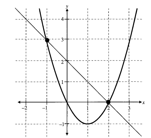 Now in the figure, we can see that graphs of \(y=x^2-2 x\) and \(y=2-x\) intersect at points \((-1,3)\) and \((2,0)\) or where values of \(x\) are \(x=-1\) and \(x=2\), which are in fact zeros or roots of the equation \(x^2-2 x=2-x\) or \(x^2-x-2=0\).